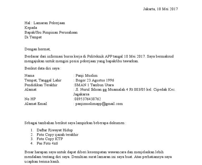 Contoh surat lamaran kerja di pt sebagai karyawan. Contoh surat lamran kerja simple. Apalagi pt yang masih membutuhkan tenaga padat karya dan pengerjaan produksi secara manual. Berikut ini adalah biodata singkat saya. Contoh surat lamaran kerja sebagai admin perusahaan. Contohh surat lamaran kerja doc. Maka saya yang bertanda tangan di bawah ini Midi indonesia, tbk sedang membuka lowongan pekerjaan di beberapa cabang perusahaannya yakni alfa supermarket, lawson. Dengan surat lamaran pekerjaan pihak perusahaan bisa membaca dan menebak karakter dari pelamar kerja. Dijamin lolos seleksi hrd, begini contoh surat lamaran kerja yang benar. Contoh surat lamaran kerja kami sajikan kepada para pelamar atau pencari kerja agar lebih mudah dan cepat mengajukan lamaran sesuai posisi yang ditargetkan. Contoh surat lamaran pekerjaani di hotel. Contoh surat lamaran kerja yang baik dan benar.